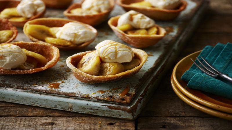 Tortillas tièdes fourrées de bananes et de sauce sucrée au caramel servies avec de la crème ou de la glace.
